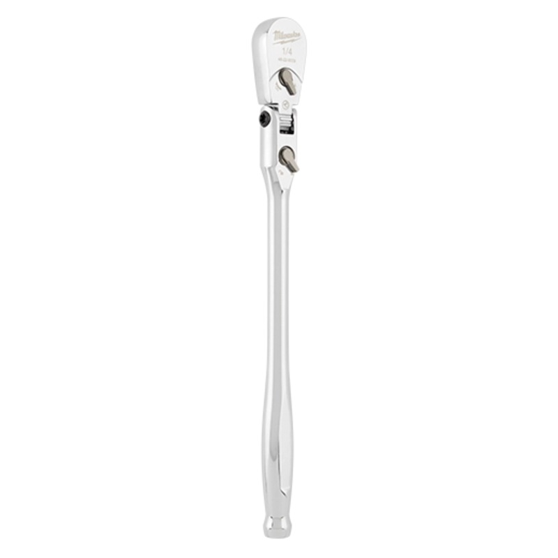 The MILWAUKEE 1/4 Drive 9 Flex Head Ratchet with a 4 arc swing provides better access and is more adaptable to working in spaces with different angles. The ratchet head can flex to 7 different positions and has a lever to lock the head in place. The extended handle length offers increased leverage for stubborn nuts and bolts, a slim profile design, and a flush directional lever for better accessibility. The all-chrome finish makes cleaning the extended-reach ratchet easy. This ratchet is backed by Milwaukee’s Mechanics Hand Tools Lifetime Guarantee.