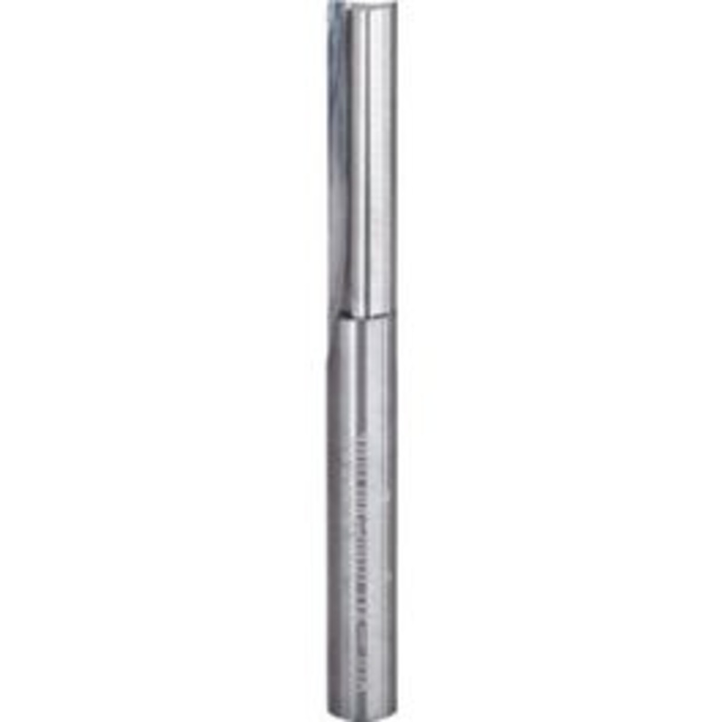 1/4" diameter, 2-flute carbide straight router bit. 1/4" shank, 1" cutting length, 2-1/2" total length.