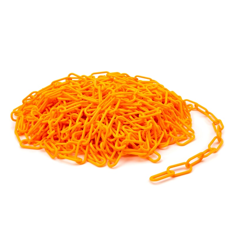 Create highly visible semi-permanent and temporary safety barriers, lanes, aisles and more with a length of STEELMAN 61076 Hi-Viz Orange Plastic Safety Chain. Sold in 100-foot lengths, this lightweight yet durable plastic chain is made of solid plastic instead of heavier steel and metal chain links that rust and corrode. Thanks to its plastic construction it is easily portable and will not damage vehicles when used to create temporary parking lots. The high visibility orange color makes this chain ideal for use marking out lanes and aisles at festivals, shows, and carnivals. It is also perfect for warehouse and retail use when you need to temporarily close off areas to customers or segregate product.