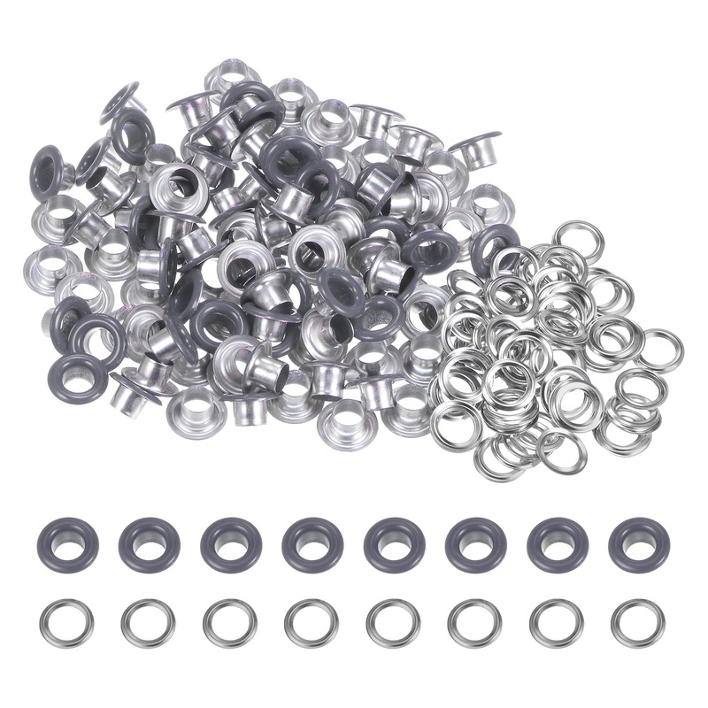 100 set 5mm metal eyelet grommets, each set includes 2 parts: an eyelet, and a washer.These small round grommets are made of metal with a painted finish, making them sturdy, corrosion-resistant, and durable.Good for clothes, shoes, bags, card making, canva
