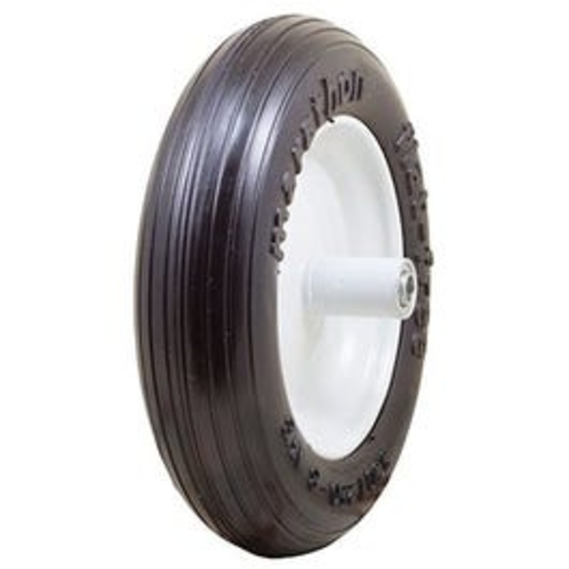 Eliminate downtime! Marathon flatfree 3.50/2.50-8-inch tire is the most commonly found on residential wheelbarrow. This tire is also known as a 4.00-6-Inch tire (13 inches in diameter). Airless tires have the same bounce, feel, cushioning, and performance as a regular air-filled or pneumatic tire. They are also non-marking and will not be affected by ozone or UV rays. Airless tires are made of lightweight, solid polyurethane foam and are guaranteed to never go flat. Mounted on an 8-Inch steel rim with a 6-Inch centered hub and 5/8-Inch ball bearings. Includes grease zerk.