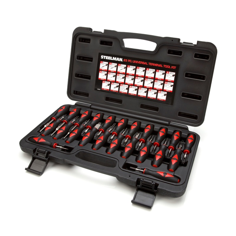 As many technicians know, automotive electrical terminal blocks are designed to hold wires amid the bumps and vibrations experienced in modern cars and trucks and not let go or loosen so when it comes time to replace or repair those blocks or wires, they never want to let go and special tools are needed to separate them. The STEELMAN 95839 23-Piece Universal Terminal Tool Kit was designed to do just that, to let you separate the wires from their terminal blocks without causing damage to either. These connector pin release tools are made with non-magnetic stainless steel tips on chrome-plated hollow brass shafts mounted in comfortable TPR layered polypropylene handles. The tools included in this kit will work on terminals found in a wide variety of BMW, Volkswagen, Audi, Jaguar, Porsche, Saab, Skoda, Ford, Renault, Citroen, Chrysler, Fiat, Honda, Mazda, Mitsubishi, Toyota, Seat, and Opel vehicles. A convenient application reference chart listing tool shapes, sizes, and compatible manufacturers is included inside the blow-molded plastic storage case. The following tools are included in this set: 5mm x 20.5mm, 4.37mm x 24.5mm, and 3.25mm x 20mm Tube; 0.9mm x 14mm, 0.9mm x 16mm, 1.6m x 15mm, 1.55mm x 20mm, 1.55mm x 17mm, 1.6mm x 20mm, 1.6mm x 24mm, and 1.6mm x 26mm Flat Twin Blade; 1.6mm x 20mm Flat Twin (Angle Tips); 1.15mm x 18mm, 1.8mm x 18mm, and 3mm x 18.5mm Flat Blade; 1.65mm x 23mm, and 1.8mm x 18mm Flat Blade Chisel Tip; 1mm x 18mm Square Blade; 1mm x 18mm Flat Notched Blade; 1mm x 24mm Flat U-Notch Blade; 1mm x 9mm Triple Flat Blade; 0.9mm x 19mm Pin Blade; and 1mm x 19mm Pick Blade.