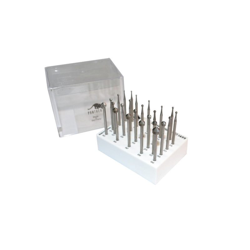 The Panther brand is made from hardened tool steel, and always individually inspected to assure the highest quality products. Set of 24 burs, sizes 010, 012, 013, 015, 016, 017, 018, 019, 020, 021, 022, 023, 025, 027, 030, 033, 035, 037, 040, 045, 047, 050