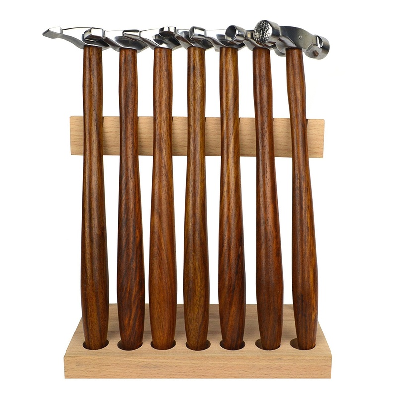 This set features seven useful hammers for all of your jewelry forming needs! Each hammer is constructed of a polished steel head with a cherry wood handle. Includes a Mini Wide Raising Hammer, Mini Narrow Raising Hammer, Mini Designer Hammer, Mini Sharp Designer Hammer, (2) Mini Embossing Hammers, and a Mini Planishing Hammer. The easy-to-assemble wooden stand allows for convenient storage!