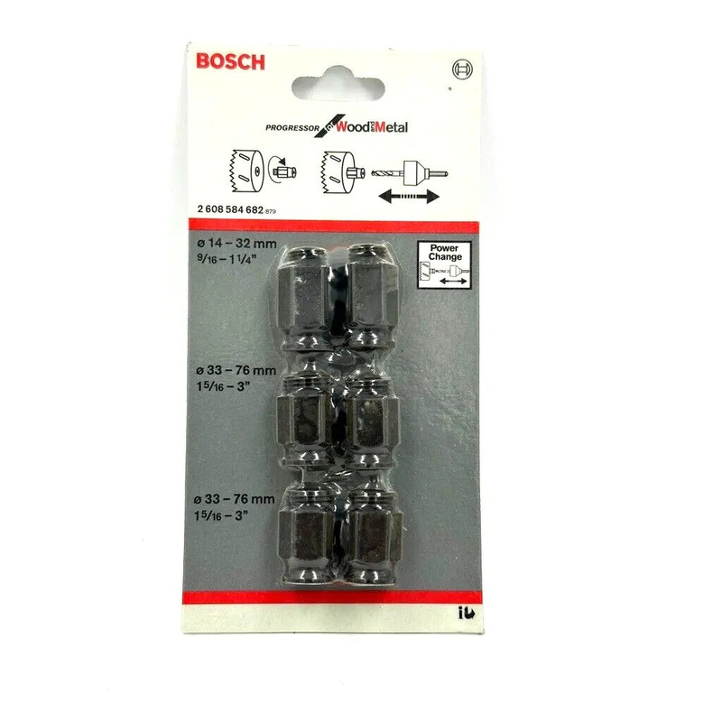 Bosch Professional Transition Hexagon socket adapter set 2608584682Technical DataPack quantity6 PcsIncludes2 adapters for diameter 14-30 mm (1/2""-20UNF thread)4 adapters for diameter 32-210 mm (5/8""-18UNF thread)