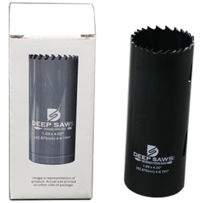 Length 4" TPI 4-6 Diameter 1.688" Deep Saws 4" Deep Bi-Metal Hole Saw, 4-6 TPI, 1.688" Diameter - 100826 4" Deep Bi-Metal Hole Saw for Wood Plastic & Metal Industrial quality M42 bi-metal hole saws at fair prices. Fill your tool box and be ready for any jo