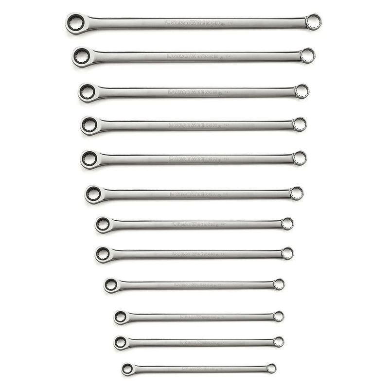 The GEARWRENCH XL GearBox double box ratcheting wrenches feature a non-ratcheting box end for breaking loose stubborn fasteners and a ratcheting box end to make quick work of loosening and tightening fasteners without having to remove the wrench. The wrenches are up to 40% longer than our standard double box ratcheting wrenches providing more access and strength to fasteners. The ratcheting box end is designed to need as little as 5 to move fasteners versus 30 for standard wrenches. The wrenches are made from a strong alloy steel with a bright, full polish chrome finish. The ratcheting box end features off-corner loading for a better grip on the fastener and reduces fastener rounding. The 0 offset on both ends and slim profile of the wrench provides greater access to fasteners in the tightest spaces.