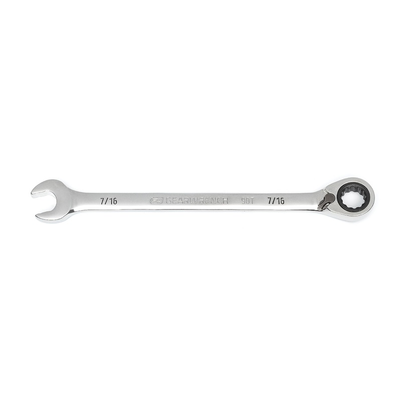 GEARWRENCH 90-tooth reversible ratcheting wrench swing arc of just 4 turns fasteners in extremely tight spaces. Longer, wider beam delivers improved reach, leverage, and comfort. Large color-coded SAE/metric markings make size identification easy. All exceed ASME performance specs and come with the trusted GEARWRENCH Limited Lifetime Warranty.