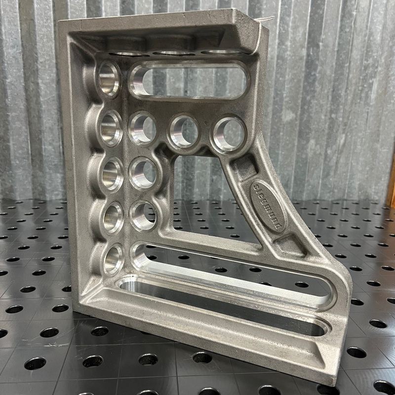 The Siegmund 2-280121: 300mm GK Right Stop and Clamping Square (Aluminum/Titanium) facilitates a multitude of clamping options, due to its three-dimensionality. It is especially designed for working with heavy parts, and can be used as a stop as well as a table extension. Stop and Clamping Squares are manufactured using an aluminum/titanium alloy, to reach maximum stability. Ordering in pairs is recommended.