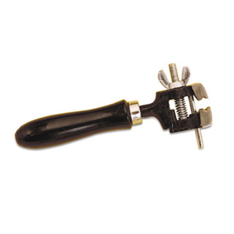 Grobet USA Hand Vise with Wood Handle, 6-1/4" OAL - 58.130 A lightweight vise mounted in a wood handle. Smooth jaws are 1-1/4" wide and open to 1". Overall length is 6-1/4".
