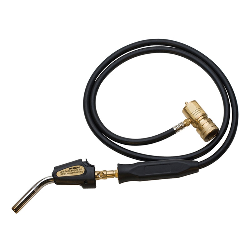 All-in-one; no assembly required. For use with Propane or MAPP disposable fuel tanks. Features an automatic one-touch ignition. Efficient swirl flame for maximum-heat output. Comfort ergonomic grip. 5 ft hose (1.5 meters); with all-brass components. Reache