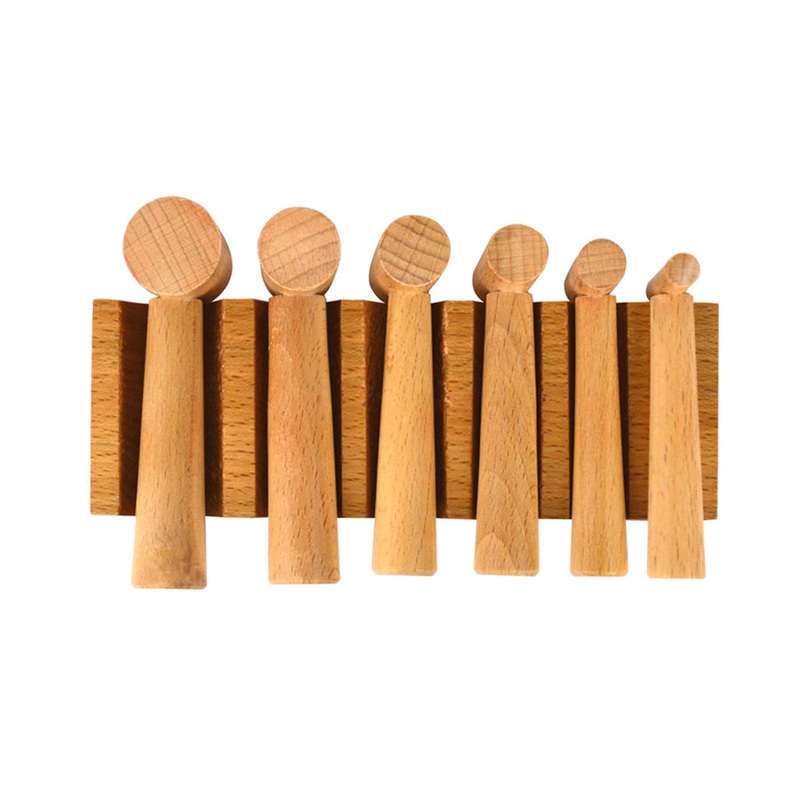 Made of smoothly finished hardwood, this block includes six hammer punches with corresponding head diameters to work with the six u-channels in the block. Widths of U-channels and hammer punches measure: 25, 22, 18, 16, 13.5, and 11 mm. On the reverse side