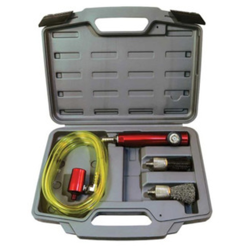 The Flow-Thru System with Brush & Venturi is a versatile, first-time tool. It features stainless steel and abrasive nylon brushes, and a venturi that attaches to an ergonomic, anodized-aluminum handle with integrated flow-control valve. It provides an unparalleled cleaning performance when air pressure is combined with degreasing solvent and simultaneous scrubbing action via the flow-through brush heads.