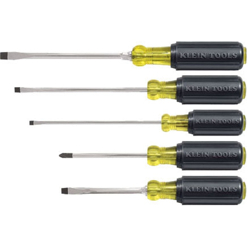 Consists of five screwdrivers: 8-11/32″ square-shank keystone-tip, 9-3/4″ round-shank cabinet-tip, 10-15/16″ round-shank keystone-tip, 8-5/16″ round-shank #2 phillips-tip, 10-11/32″ round-shank cabinet-tip. Set is provided in reclosable seal-tight vinyl pouch.