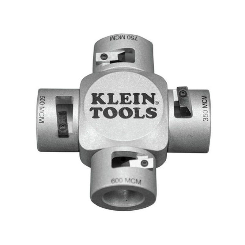 Klein Tools 21050 750 - 350 MCM Large Cable Stripper Details A quick and effective tool to cleanly remove the insulation on MTW/THHN/THWN-2 cable without nicking the wire. Clover design features four different sizes (350, 500, 600 and 750 MCM) in one tool.
