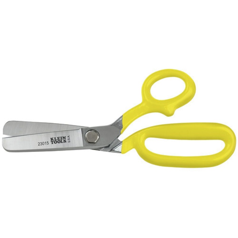 Klein Tools 23015 9.75 in. Single-Serrated Blade Blunt Shear Details Klein Tools Single-serrated Blade Blunt Shear (Cat. No. 23015) has a serrated blade for non-slip cutting action. Designed to cut belting, abrasive belting, heavy fabric, leather, upholste