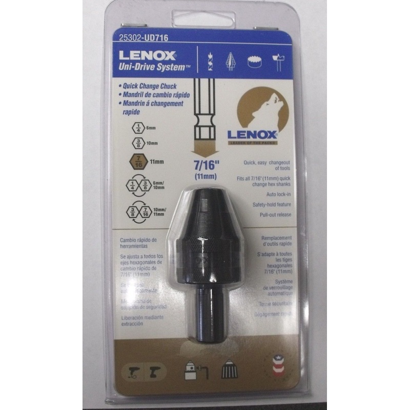 Lenox Uni-Drive 7/16" Quick Change Chuck 25302-UD716 USAQuick, easy changeout of toolsFits all 7/16" (11 mm) quick change hex shanksAuto lock-inSafety-hold featurePull-out releaseNON-WEBSITE ORDERS:This item has calculated shipping. Shipping varies by carr