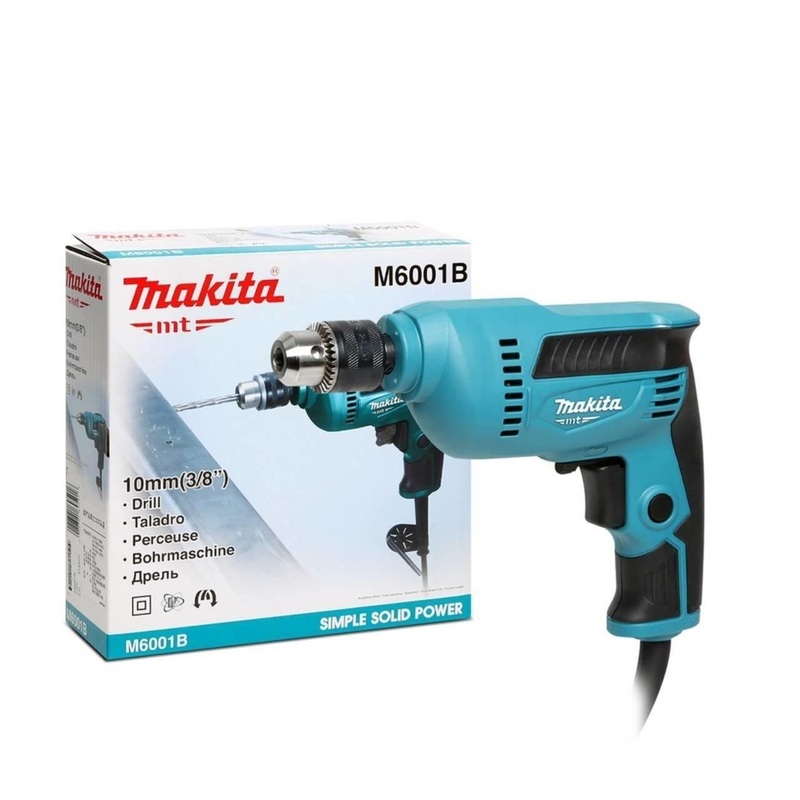 Makita Mt Series M6001B Rotary DrillCompact and lightweight, yet with enough power.Double Insulation, Variable Speed, Geared Chuck and Reversing.Technical Data Continuous rating input450WCapacitiesSteel: 10mm Wood: 25mmNo load speed0 - 3,000r/minDimensions