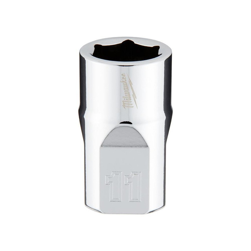 The Milwaukee 3/8 in. drive 11mm metric 6-point socket was designed from the ground to be part of the most versatile socket family. The innovative socket design has four parallel flat sides, which deter rolling and are wrench-compatible. Socket sizes are s