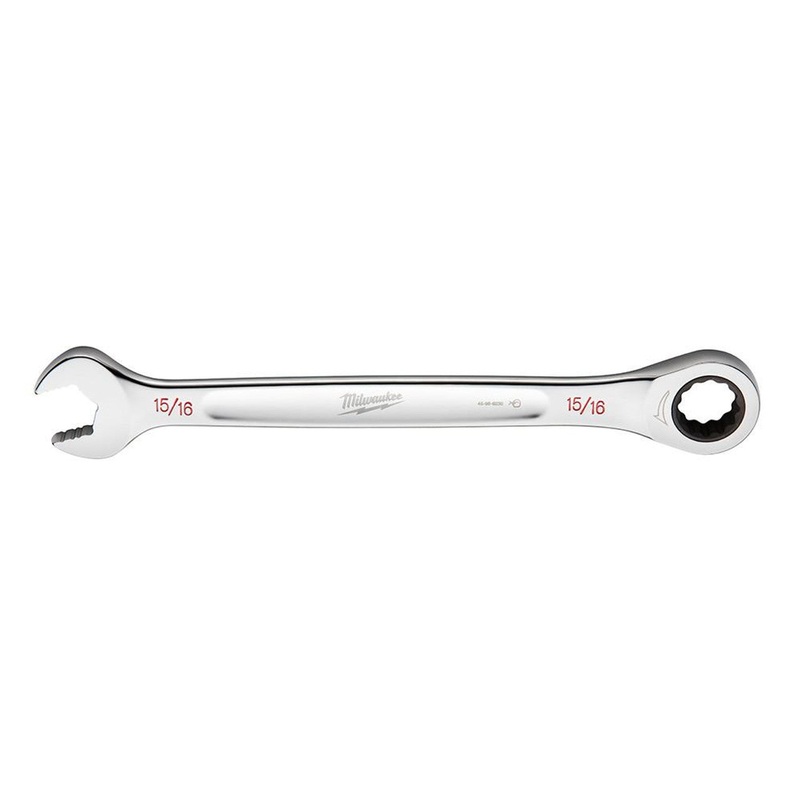 The MILWAUKEE 15/16 in. SAE Ratcheting Combination Wrench features 2.5 degrees of arc swing and 144 ratcheting positions, allowing quick and efficient work in tight spaces. This wrench has double-stacked pawls within the ratcheting mechanism, which increas