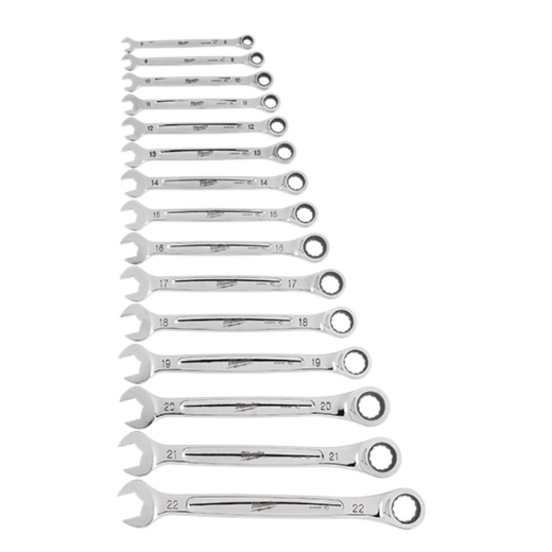 The Ratcheting Combination Wrenches feature 2.5 of arc swing, allowing our users to work quickly and efficiently in tight spaces. Our mechanic’s wrenches features durable double-stacked pawls in the ratcheting mechanism offer the longest ratchet life and improved access with 144 ratcheting positions. MAX BITE Open-End Grip improves the ratchet wrench’s grip on nuts and bolts, offering 25% more torque than smoth-faced wrenches. Each combination wrench features a comfortable I-Beam handle design for improved ergonomics. Our ratcheting combination wrench set features ink-filled size labels for easy size identification, as well as quick distiction between SAE and metric sets. The 15 piece metric ratcheting combination wrench set comes in a tray designed for steel storage drawers, allowing for efficient storage with no wasted space. We stand behind our products, offering a Lifetime Guarantee on all of our combination ratchet wrench sets.