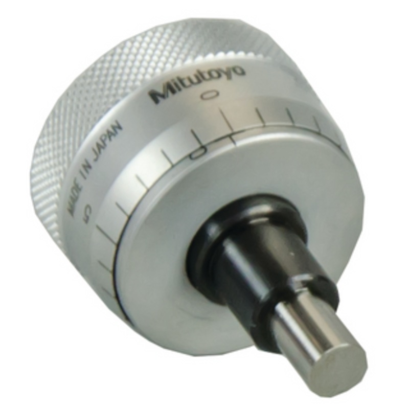 Mitutoyo Micrometer Head, Large Thimble Type, 0-0.25" - 148-355 Short thimble type with thimble diameter options.Specifications Range 0 - 0.25" Spindle end Flat Stem 0.375" Stem Plain Thimble 29 mm Fixture thickness for clamp nut - Mass 71 g Measuring surf