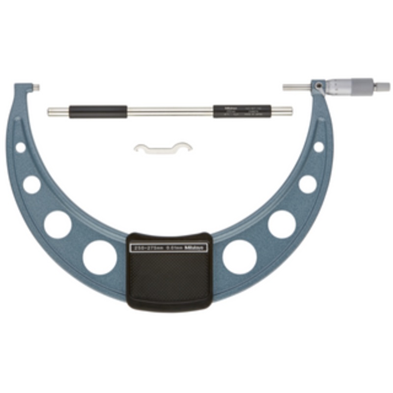 Mitutoyo Outside Micrometer, 250-275mm - 103-147-10 Lightweight workshop design with baked-enamel-finished frame. Equipped with Ratchet Stop for constant measuring force. Specifications: Accuracy 5m Flatness 0,6 m Mass 1405 g Range 250 - 275 mm Parallelism