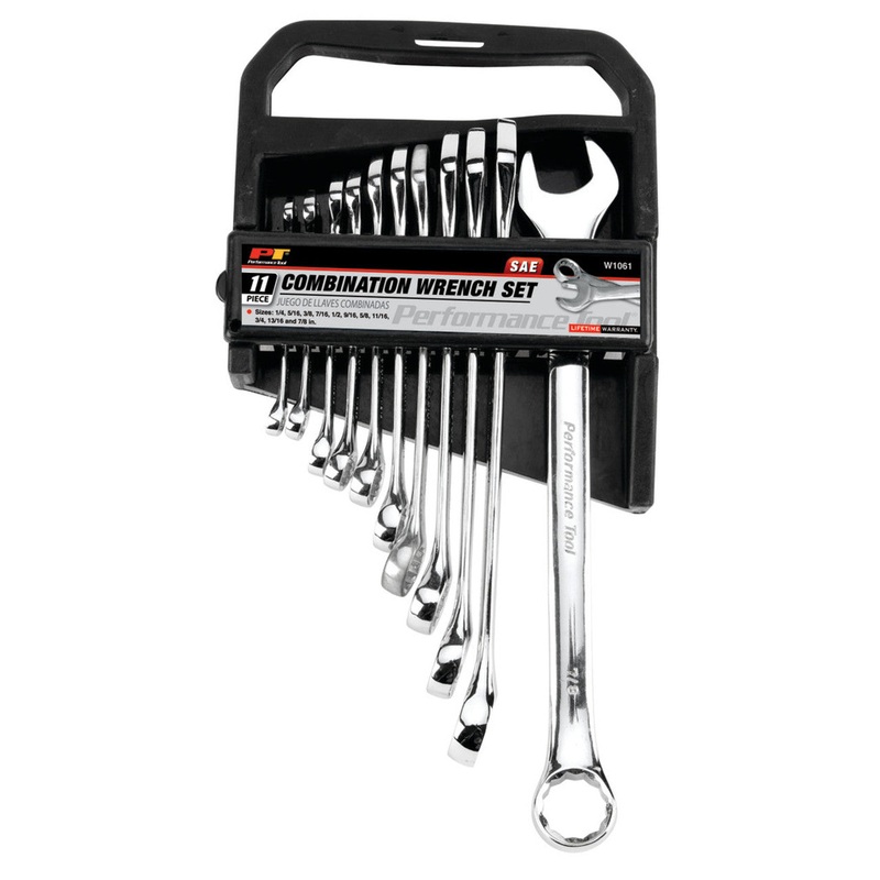 11-piece combination wrench set crafted from chrome vanadium steel. Includes sizes from 1/4" to 7/8".Standard Equipment:(11) SAE Combination Wrenches(1) Handy Storage RackSpecifications:SAE Sizes: 1/4, 5/16, 3/8, 7/16, 1/2, 9/16, 5/8, 11/16, 3/4, 13/16 and
