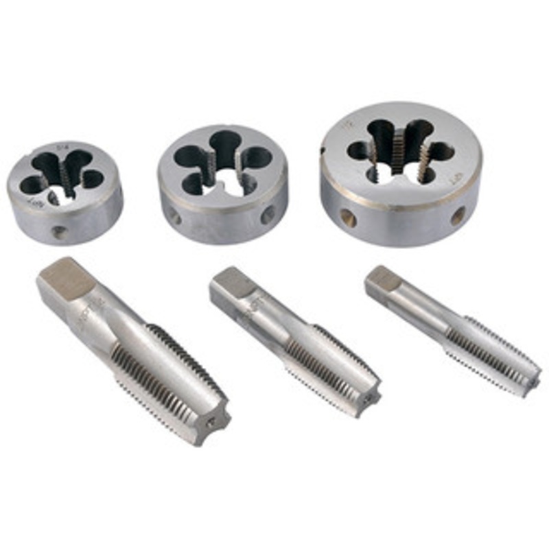 Precise 6 Piece 1/4-1/2" NPT Taper Pipe Tap & Die Set - 1011-3313 Right hand NPT pipe thread. For use in hand operations. Made of carbon steel. High speed steel. 3 flute taps. Straight shank taps. Includes one of each tap & die 1/4"-18, 3/8"-18 and 1/2"-14