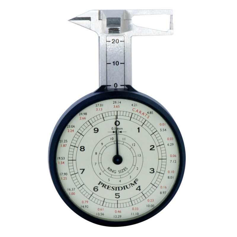 Presidium Dial GaugeAccurately, and easily measures gemstones and delivers millimeter read outs with instant carat conversion. Includes gemstone weight estimations tables as well as a protective pouch.Features:Measures 0.0-2 3mm, with .1 accuracy.Convenien