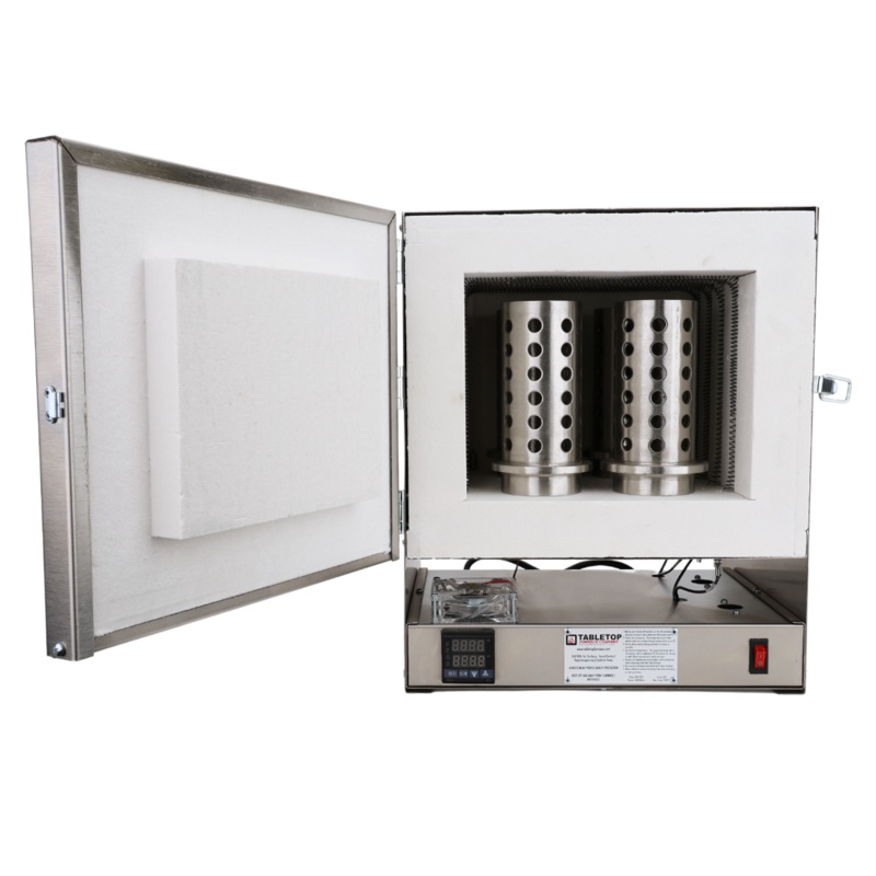 Introducing the all-new TableTop Furnace Hi-Temp XL Burnout Oven. The Hi-Temp XL kiln reaches a maximum temperature of 2000F. This kiln uses a PID temperature controller with 30 Steps Ramp/Soak. It comes complete with a digital control panel, a durable and new high-temperature thermocouple, 1700 watts of power, a standard 110V plug, and a wide opening door. It is ideal for a wide variety of burnout applications, such as carvable wax for investment casting, 3D resin/PLA, dental applications, and more! The interior firing chamber measures approximately: 8″ tall x 10″ deep x 10″ wide. Due to the nature of stainless steel under extreme temperatures, the steel surface will experience tempering and coloration changes over time. Made in the U.S.A. *Please note that the flasks in photos are not included; sold separately.