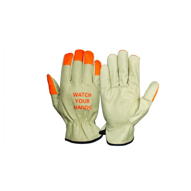 FeaturesSelect grain shoulder cowhideHigh visibility orange finger tipsSpecificationsProduct Type: Leather DriverMaterial: Grain CowhideGrade: SelectPattern: GunnThumb: KeystoneCuff: Slip-onSize: MColor: Orange