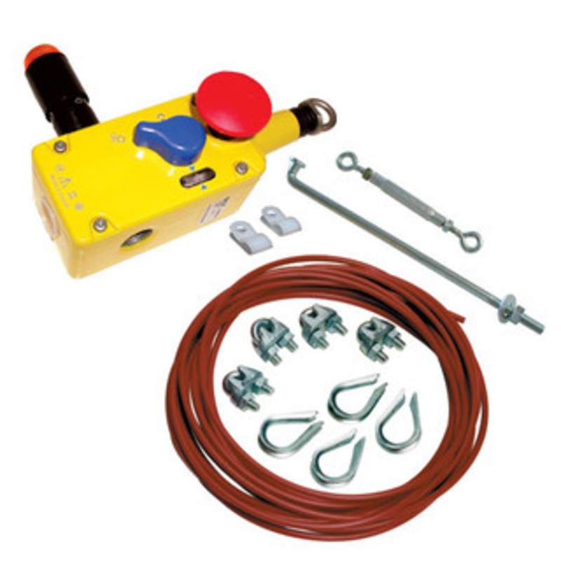 A cable tension kit, which includes thimbles, cable clamps and a turnbuckle, is included with this cable and push button e-stop assembly. When installing this switch on cable runs over 12 feet, one switch should be installed at both ends of the cable. The cables should be supported by eye bolts every 6 1/2 to 10 feet (2 to 3 m) along its length. They should also be used about one foot from each switch to ensure that all emergency-pull movement is transmitted to both units in a linear fashion. If this cable and push-button e-stop assembly is to go around a corner, a free-moving pulley should be used. Please consult the factory if this is required.