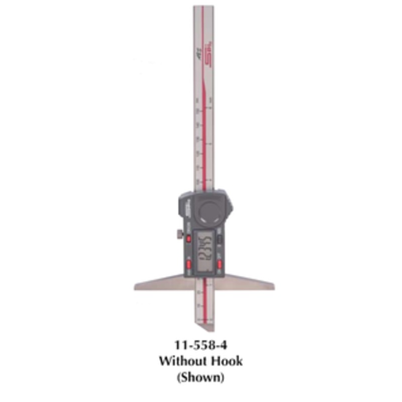 SPI Absolute Electronic Depth Gage, 0-6" Without Hook - 11-558-4 Large LCD display for easy reading. Linear scale embedded in stainless steel blade. Base Dimensions: 3.94" L x 0.28" W Resolution: 0.0005"/0.01 mm SPC/USB data output. Automatic shut-off. Bat
