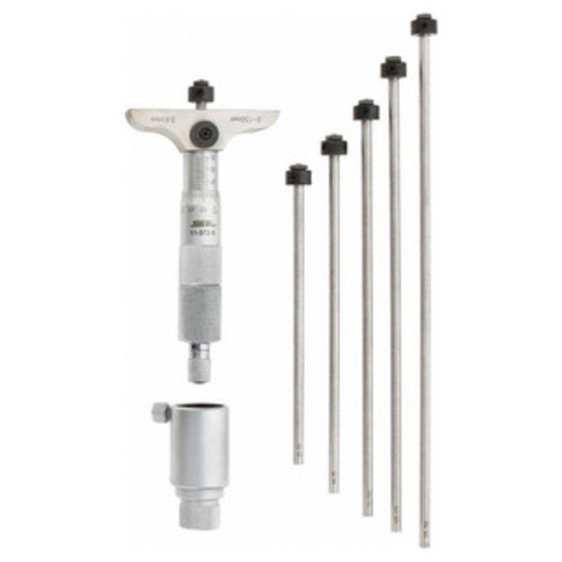 SPI Depth Micrometer, 0-150mm Range, 63mm Base Resolution: 0.001"/0.01 mm Accuracy: 0.0002"/0.005 mm up to 6" 0.00028"/0.007 mm over 6" Interchangeable rods with flat ends Ratchet stop Positive locking clamp Torque wrench included Short Form Certificate of