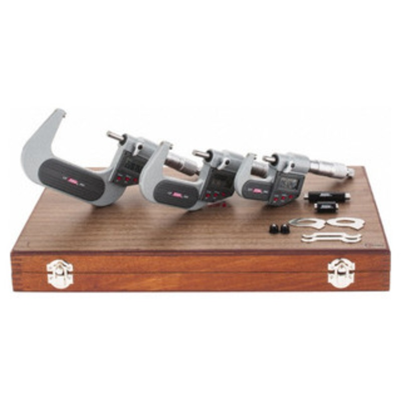 SPI IP65 Absolute Electronic Outside Micrometer Set0-3" / 0-75mm IP65 level protection Carbide measuring faces Spindle diameter: 0.25" Standard included above 0-1" range Painted frame with heat shield Resolution: 0.00005" / 0.001mm Inc./abs./Inch/Metric me