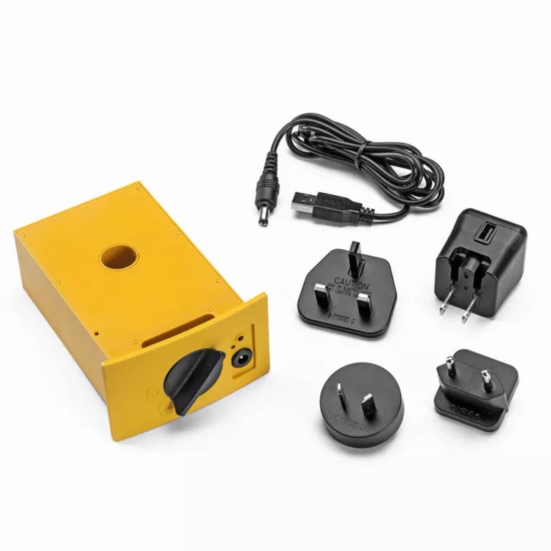Li-ion rechargeable battery with integrated charger, 4country-specific interchangeable plug adapters
