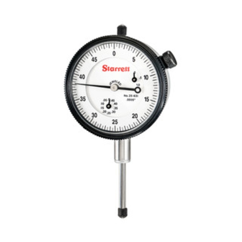 Starrett 25 Series Dial Indicator, EDP 53304 - 25-631JThe Starrett 25 Series Dial Indicator has a shockless, hardened steel gear train and jewel bearings, except where noted. It is furnished with a lug-on-center back. Antimagnetic mechanism is optional for