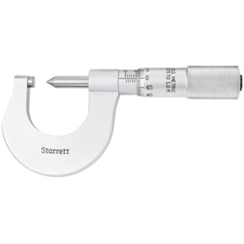 The Starrett 575 micrometers have a pointed spindle and a double V-anvil, both shaped to contact the screw thread. The micrometer reading therefore gives the pitch diameter. 0-25mm Range, 0.01mm Grad, 0.75-1.0 mm Pitch.