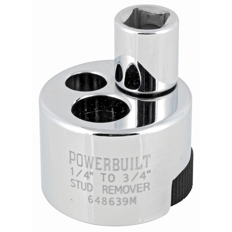The Powerbuilt Stud Remover is just the ticket for removing broken or seized studs and bolts, from 1/4 inch to 3/4 inch diameter. Just attach it to a 1/2 inch drive ratchet and turn to tighten, then turn until the stud is removed. The knurled roller uses cam action to automatically close to the right size and grip the stud tightly for easy removal.