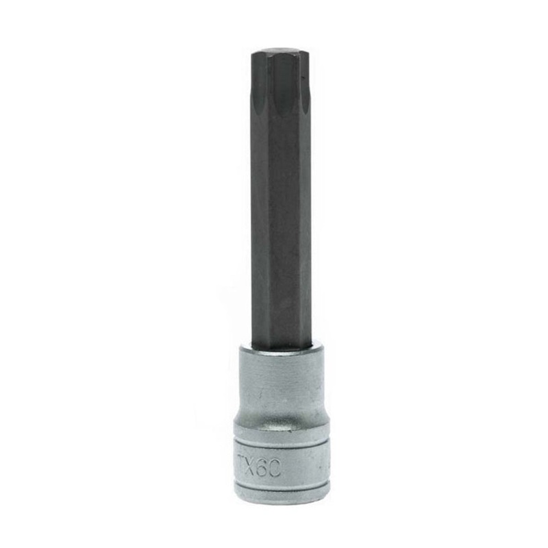 Chrome vanadium.S2 steel bits pressed in to the socket.Satin finish for a better grip when handling the socket.Ball bearing recess on the female end to grip the ratchet.Designed for use with fastenings with a TX hole.Supplied with a metal socket clip for u