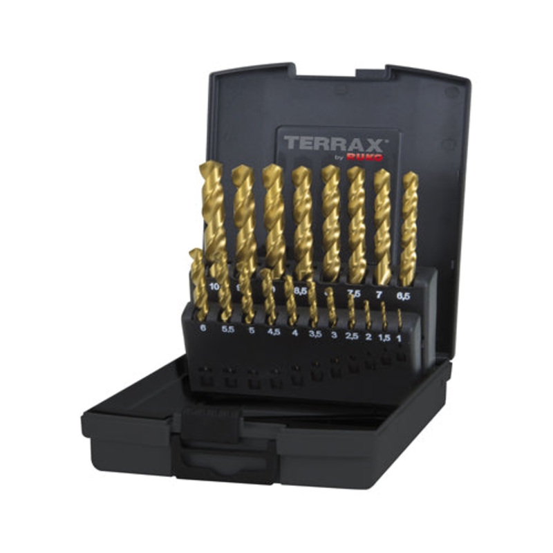The Terrax HSS Titanium Drill Bit Set contains a full range of drill bit sizes, including "half-sizes". It comes in a metal storage with Pop-up organiser.It is a high-performance ground twist drill consisting of a heavy-duty high speed steel.Sizes: 1, 1.5,