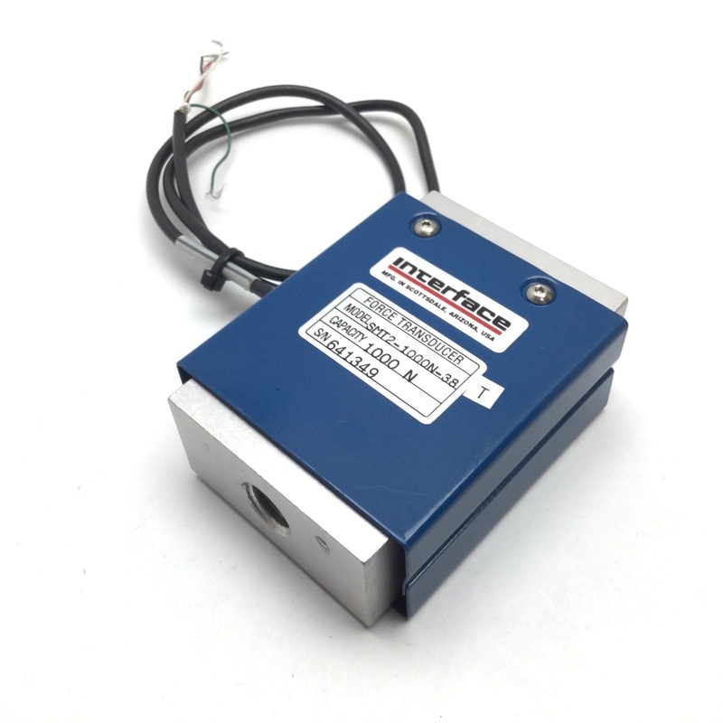 From our inventory we are selling an Interface SMT2-1000N-38 Force Transducer S-Type Load Cell 1000N Capacity, M12.