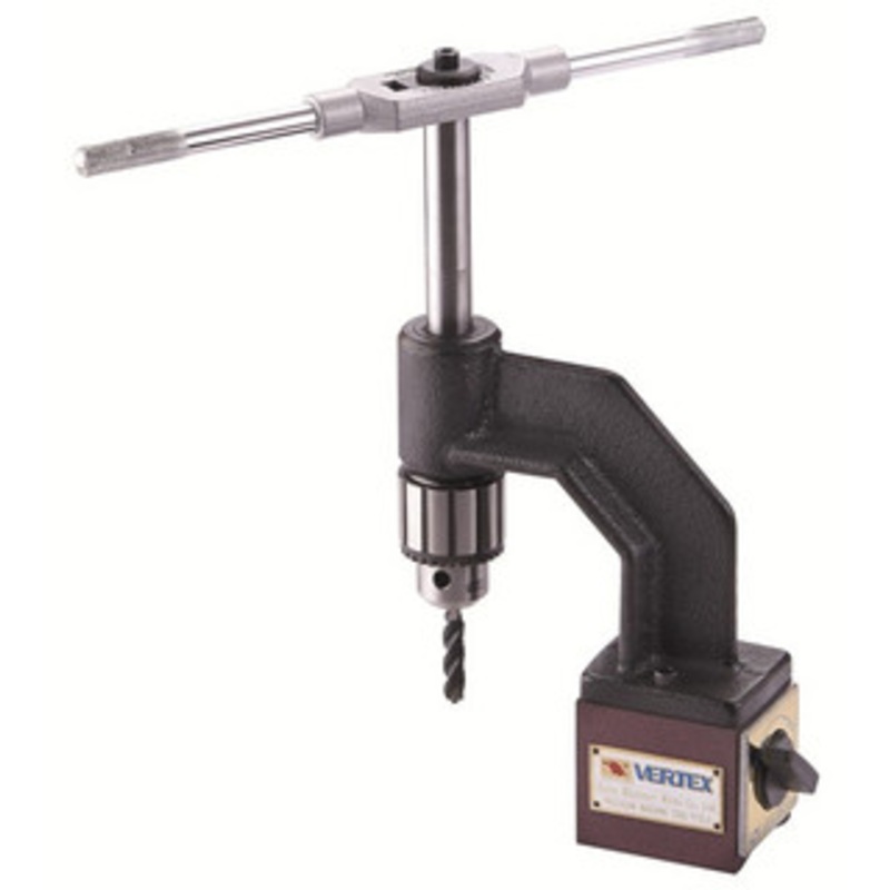 Vertex Compact Hand Tapper on Magnetic Base - 3900-0255 Made In Taiwan. Compact & portable. Maximum stroke is 2.36". Mag base is 2.36 X 2.36 X 2". Tap capacity is M3-M12. Powerful 175 lbs. permanent magnet with on/off switch. Drill chuck enables the tap to