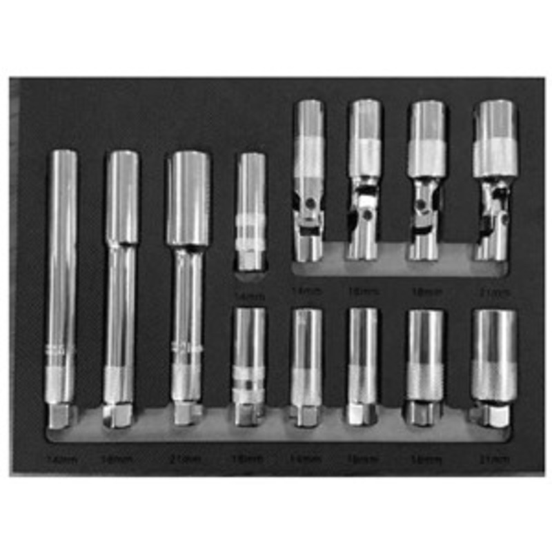 VIM Tools 13 Pc Master Spark Plug Tool Set - VMSPM100Set contains the most common spark plug socket sizes used in Euro, Domestic and Asian vehiclesSwivel Standard Extra Deep and Thin wall Sockets all 3/8" drive3 Pcs. Extra Deep 9/16. 5/8 & 13/164 Pcs. Univ