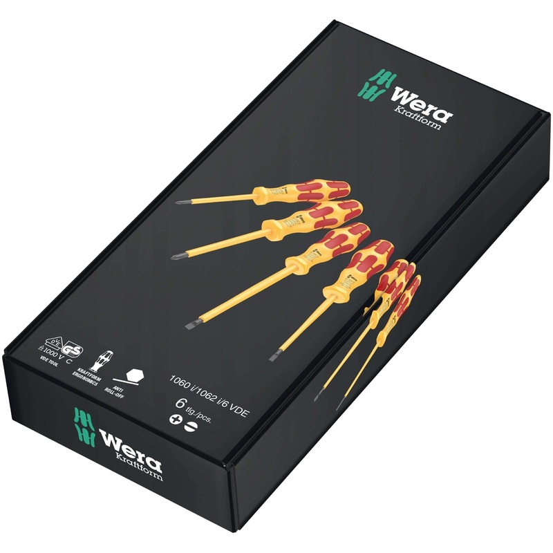 Premium Kraftform VDE screwdriver set. Multi-component Kraftform handle for fast and gentle work. The Wera Black Point tip and a sophisticated hardening process guarantee a long usability for the tip, increased corrosion protection and exact fitting accuracy. Individually tested at 10,000 V for safe working at the approved voltage of 1,000 V. The hexagon anti-roll protection avoids bits from rolling away annoyingly at the workplace. Handles marked to find and sort the tools easily.