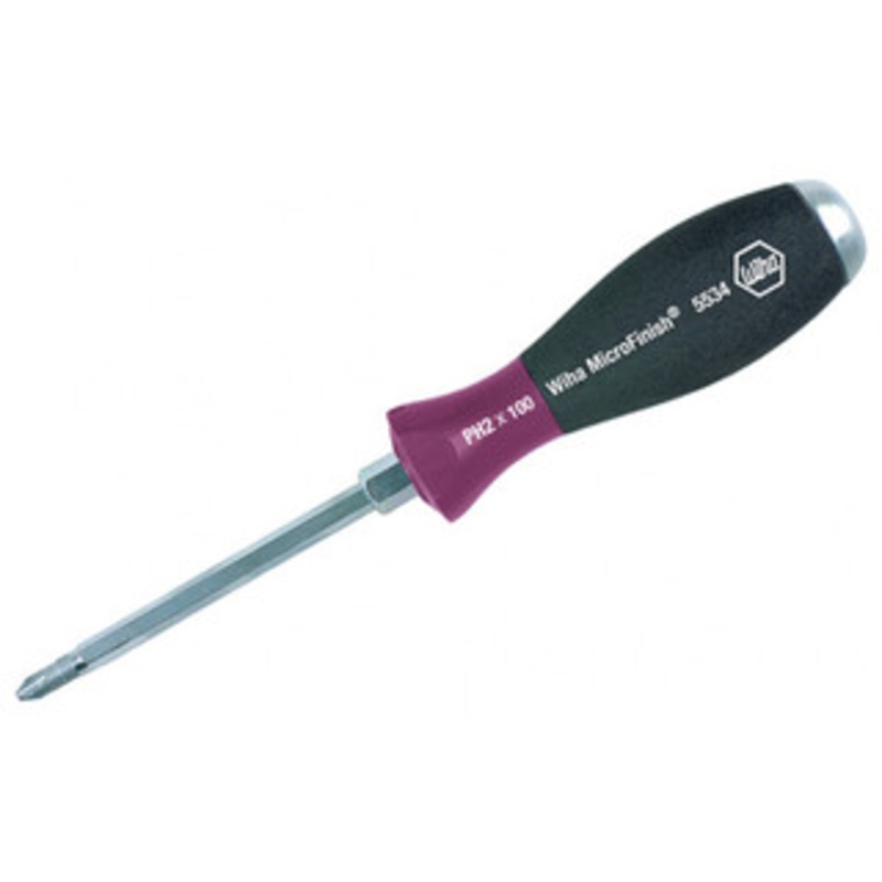 Wiha MicroFinish Extra Heavy Duty Phillips Screwdriver#2 x 100mm - 53410 MicroFinish Non-Slip Grip Phillips Screwdriver w/ Hex Bolster & Metal Striking capDetails: Textured Surface Displaces Oil and Moisture for a Safe Grip Requires less drive force & achi
